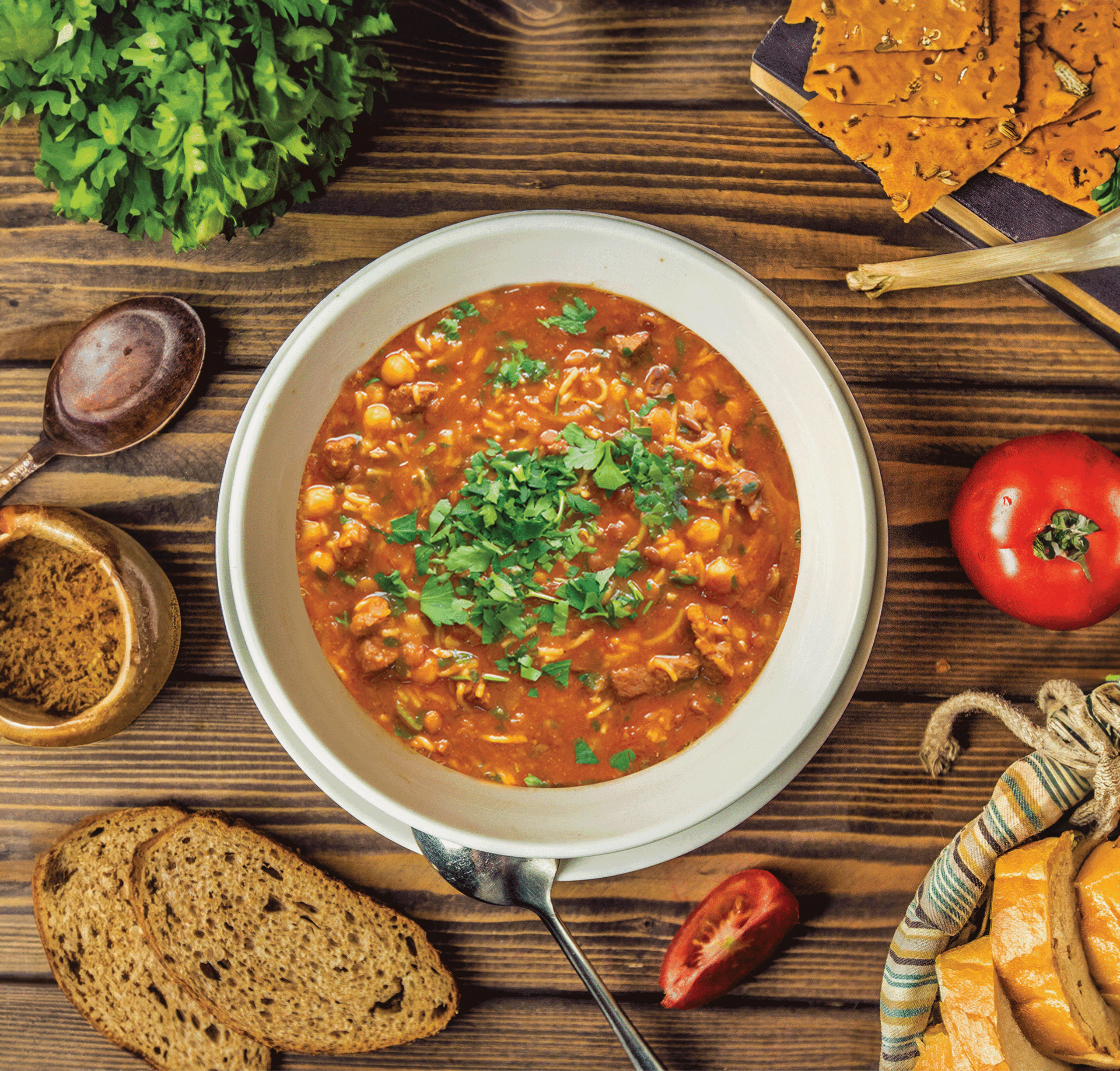 Traditional Moroccan Harira soup crafted with tender lamb, chickpeas, ripe tomatoes, and a blend of aromatic spices, delivering a rich, hearty, and flavorful experience in every bowl.